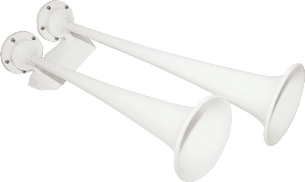 Electric trumpet air horns produce a deep, rich, distinctive tone. The trumpets are available in white epoxy coated solid brass with a non-corrosive Lexan diaphragm.