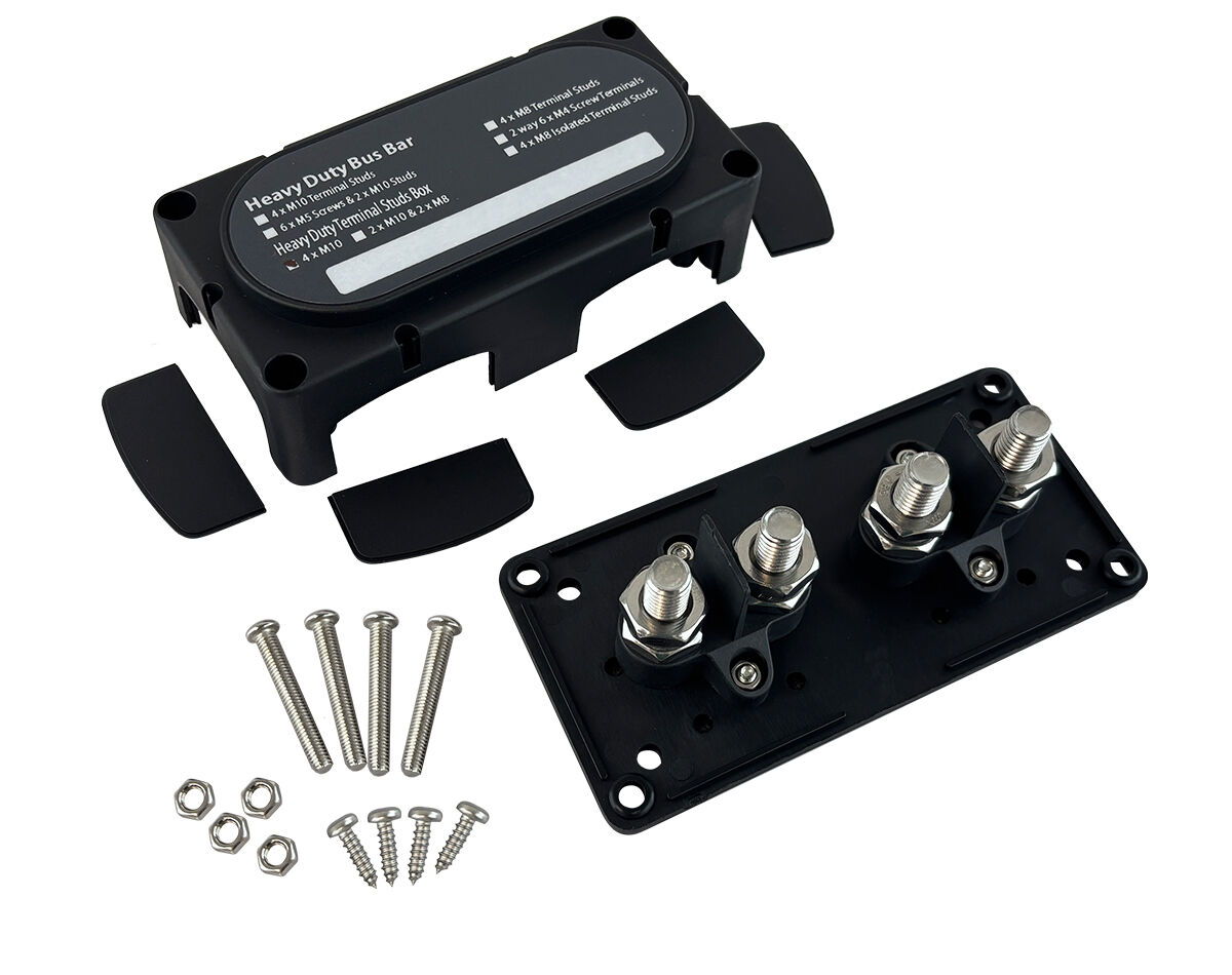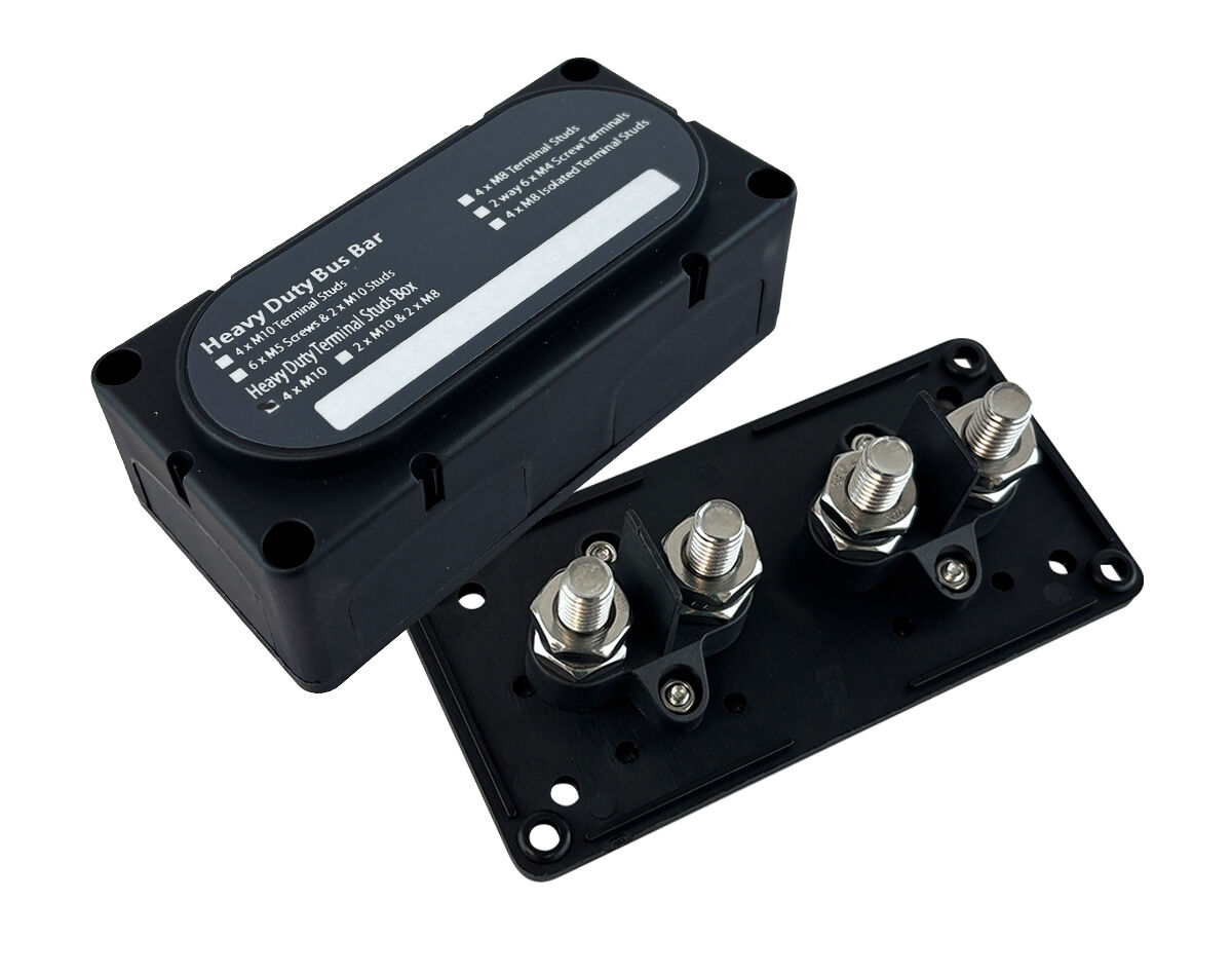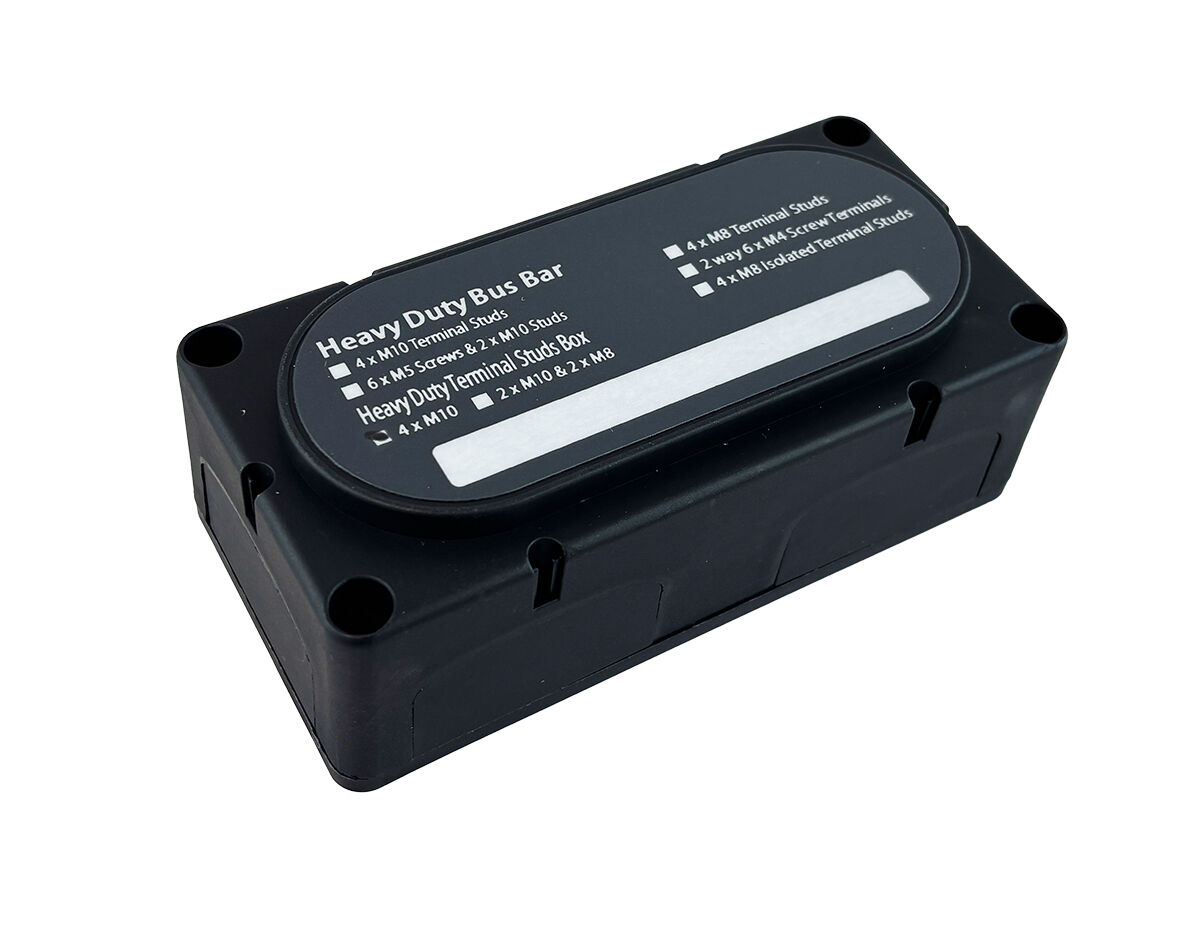 This 4-Stud Heavy Duty Insulated Terminal Box offers a clean and secure solution for terminating or distributing multiple high-current circuits.