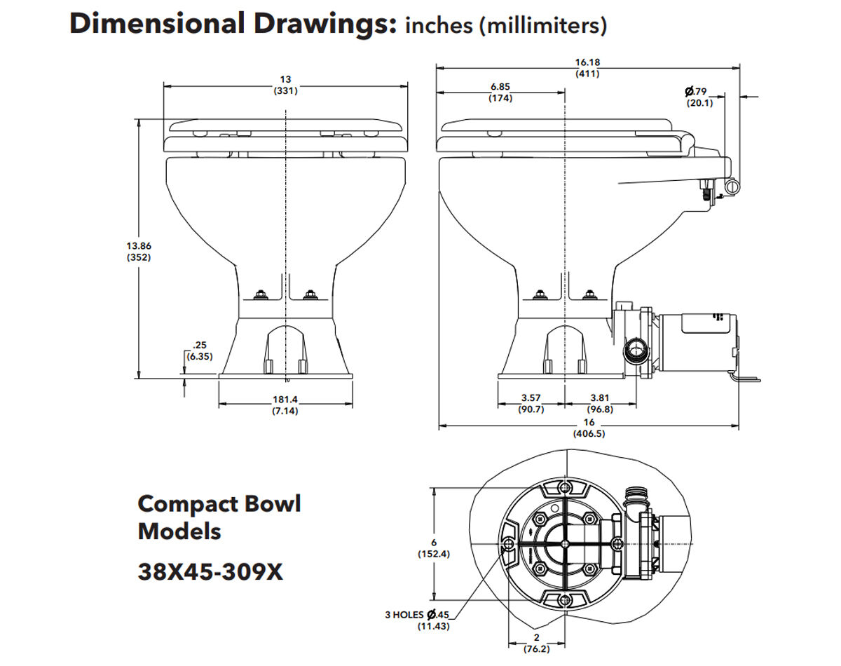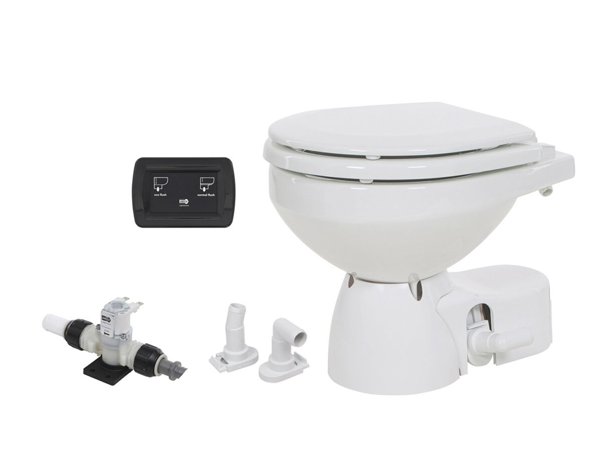 This compact seat model is for on-board freshwater flushing featuring a solenoid valve, quick-connect port fittings, integral mesh filter and a double check valve to protect against potable water contamination.