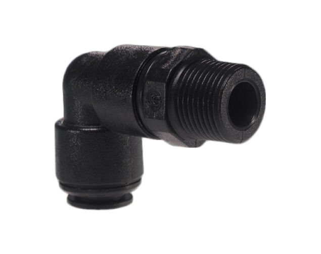 Swivel elbow push-fit fitting connects metric to BSPT thread to form a 90° pipe bend, manufactured in black acetal copolymer with food grade nitrile O-Rings.