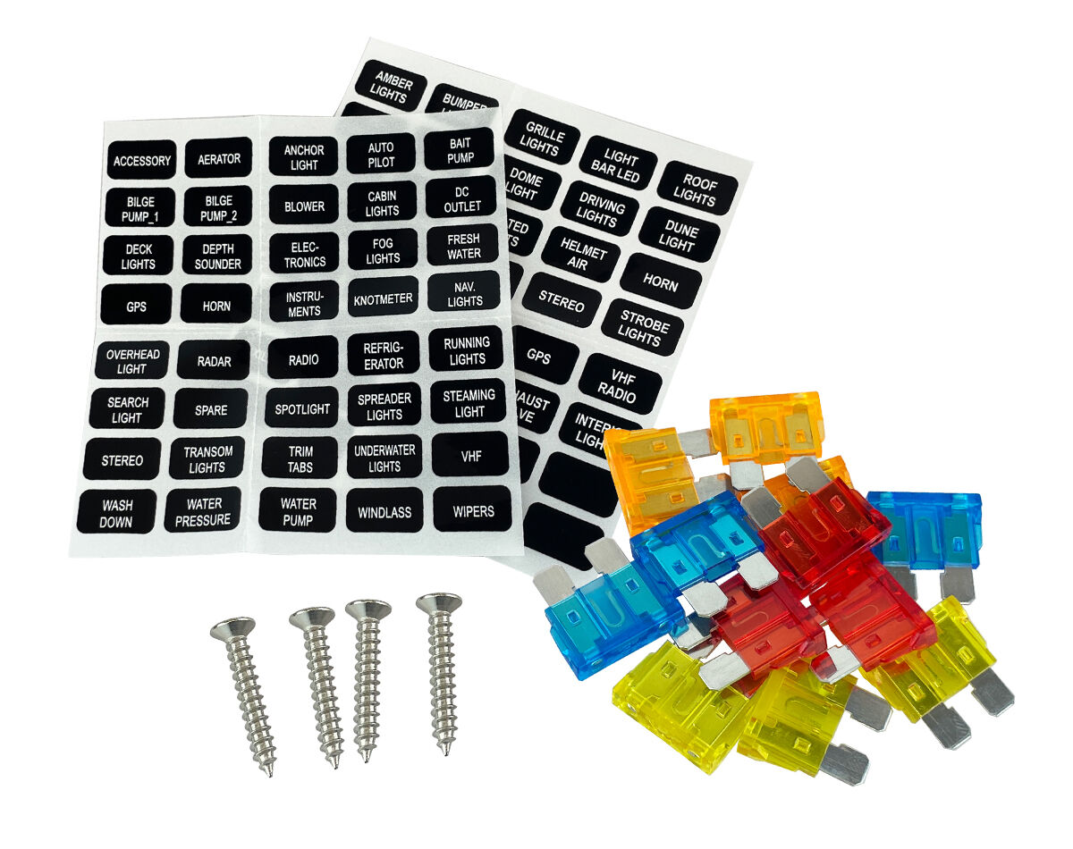 Includes negative bar, identification stickers, fuses & mounting screws.