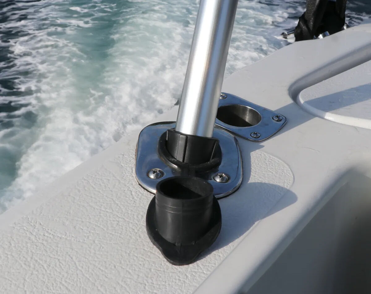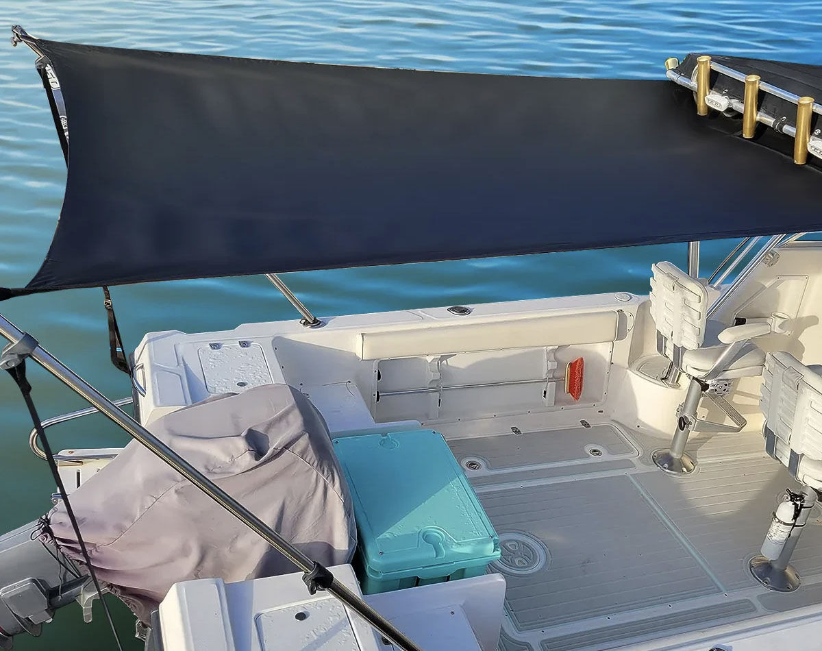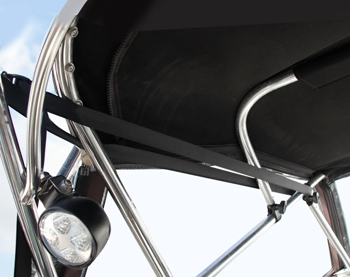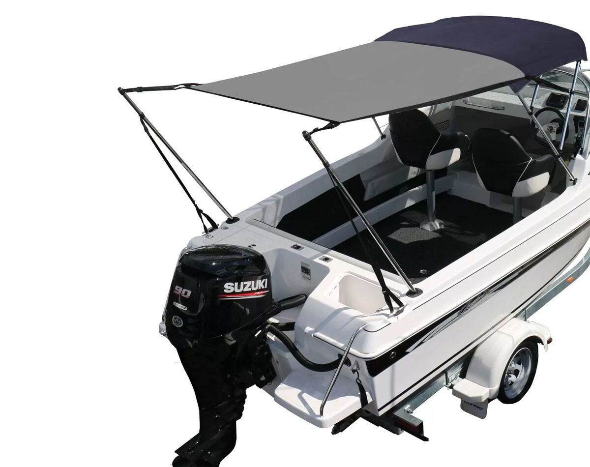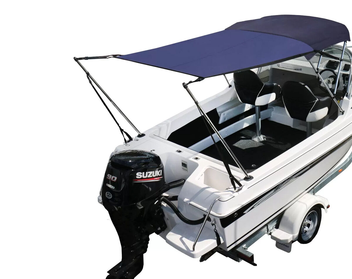 Mount securely to your bimini frame at the front, with the telescopic poles fitted into existing rod holders at the stern, and rear straps attached to cleats or rails.