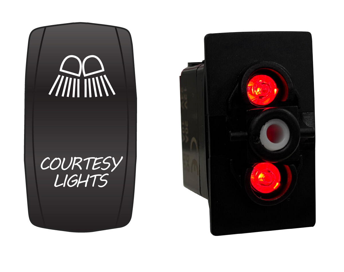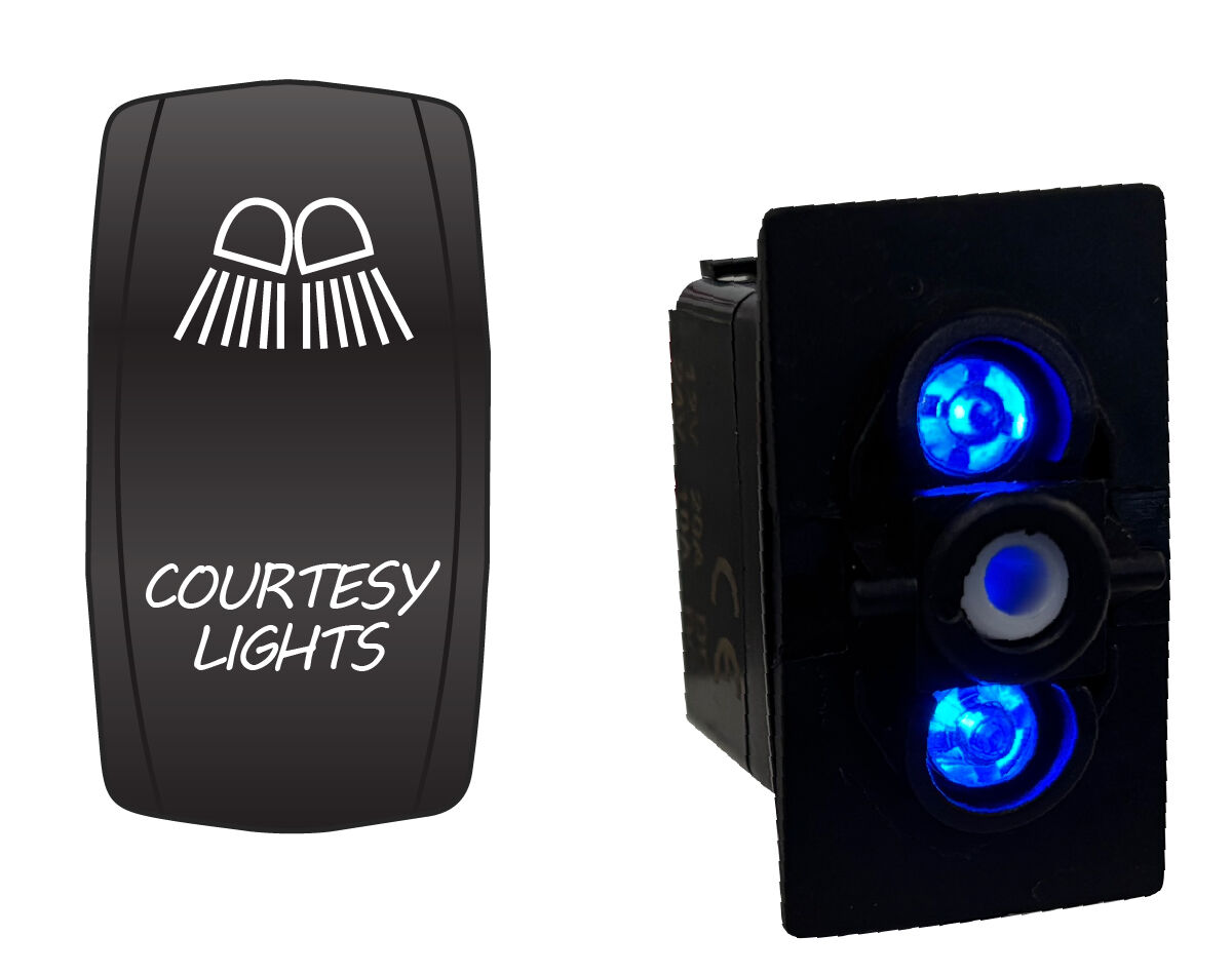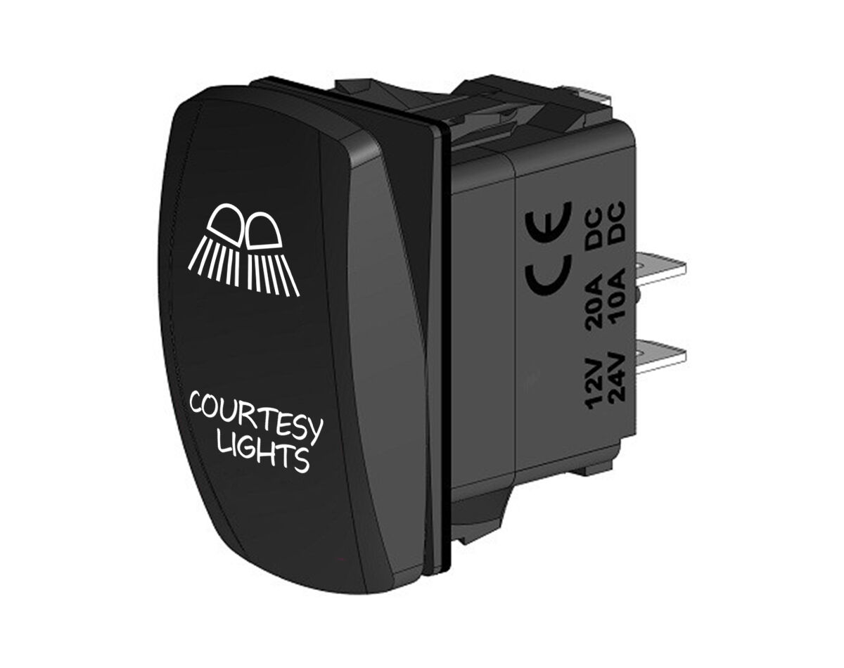 Water resistant, coloured LED illuminated rocker switch with laser etched actuator cover. Dual voltage 12/24V equipped with durable and power efficient LED lamps.