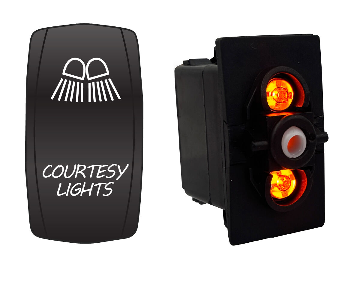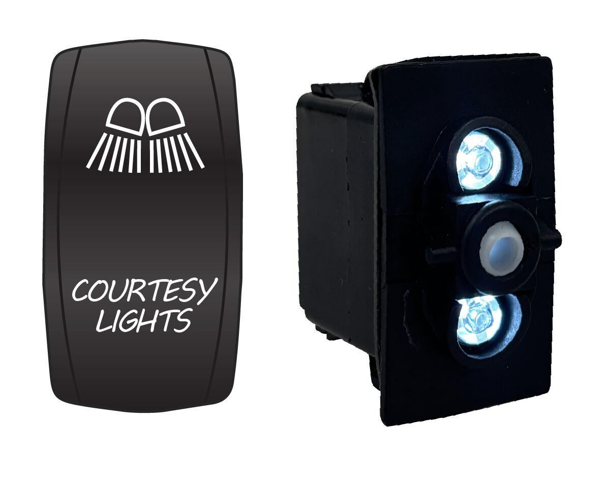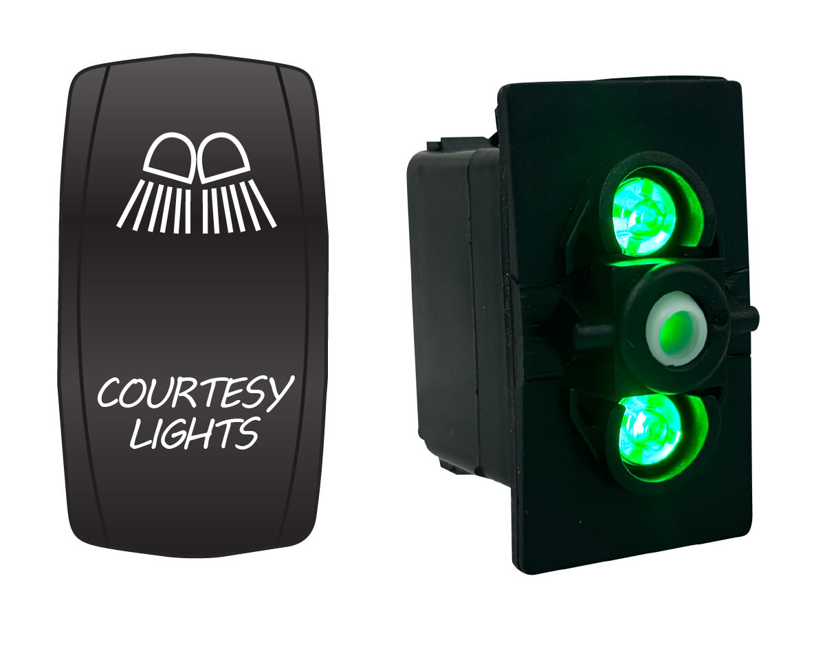 Water resistant, coloured LED illuminated rocker switch with laser etched actuator cover. Dual voltage 12/24V equipped with durable and power efficient LED lamps.