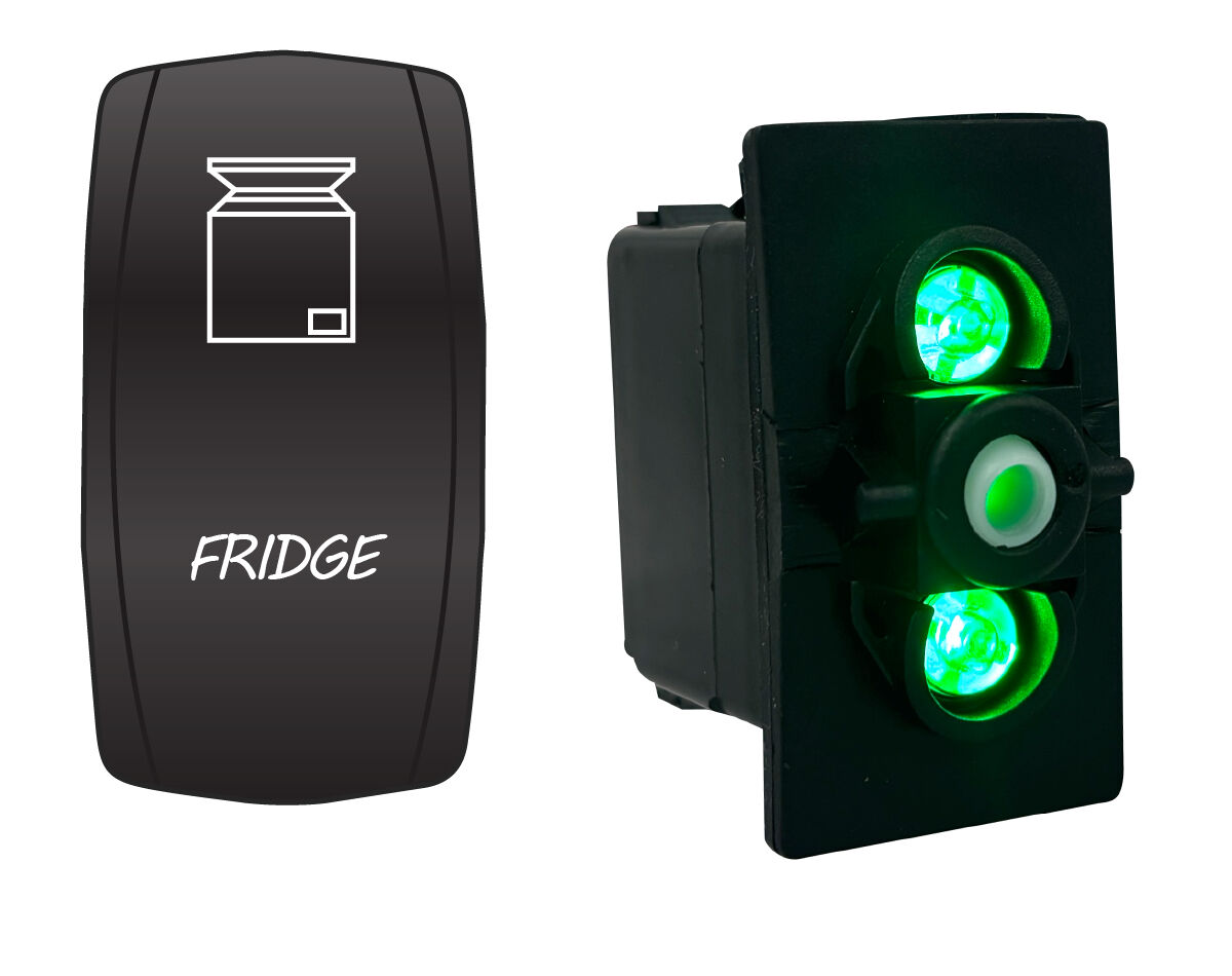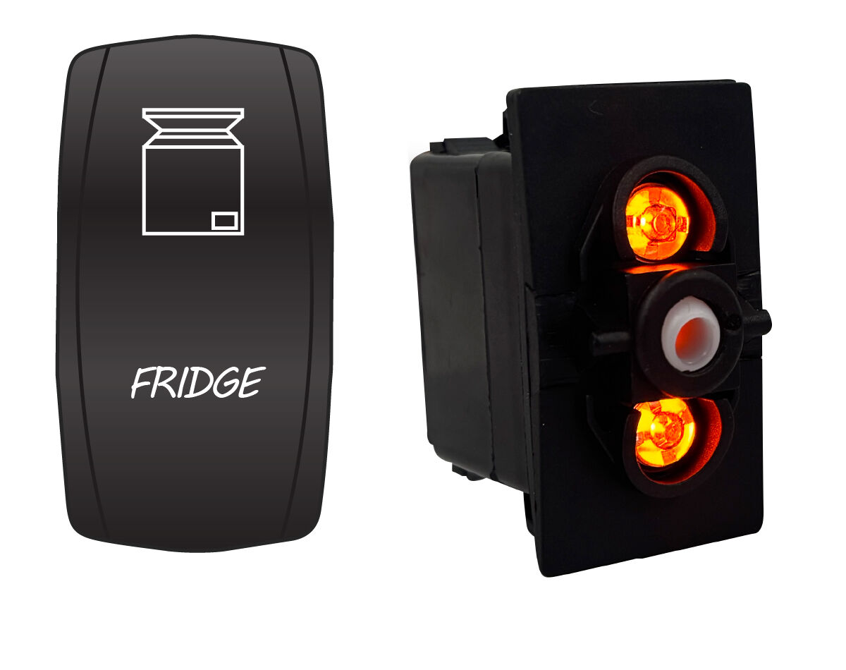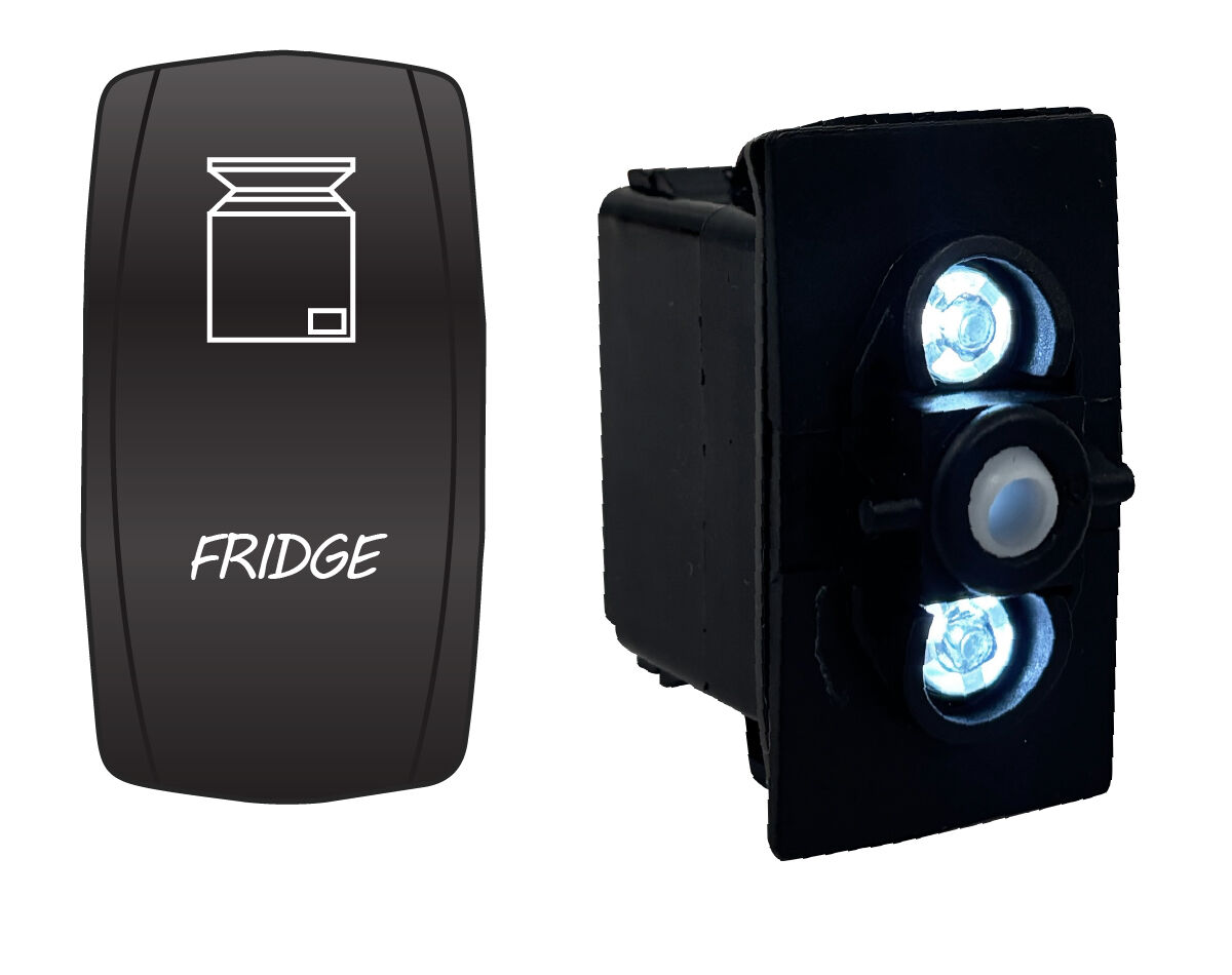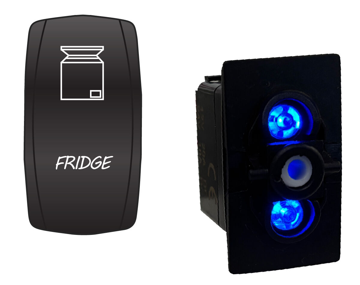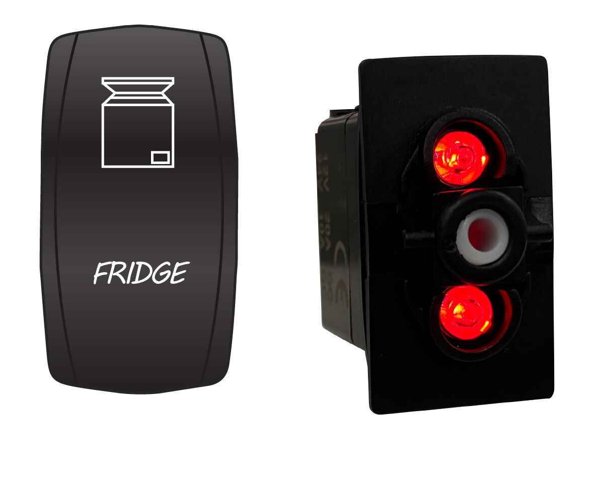 Water resistant, red or blue LED illuminated rocker switch with laser etched actuator cover. Dual voltage 12/24V equipped with durable and power efficient LED lamps.