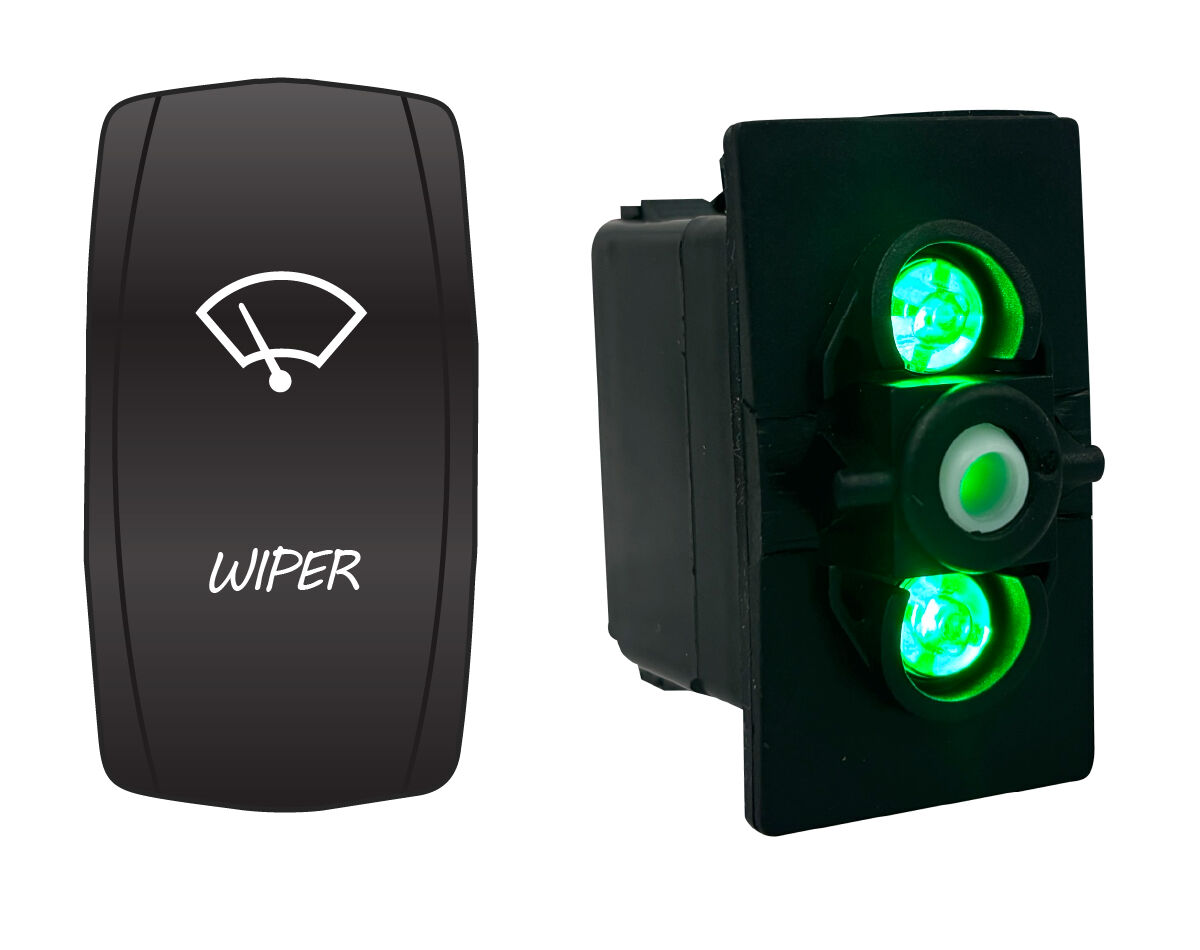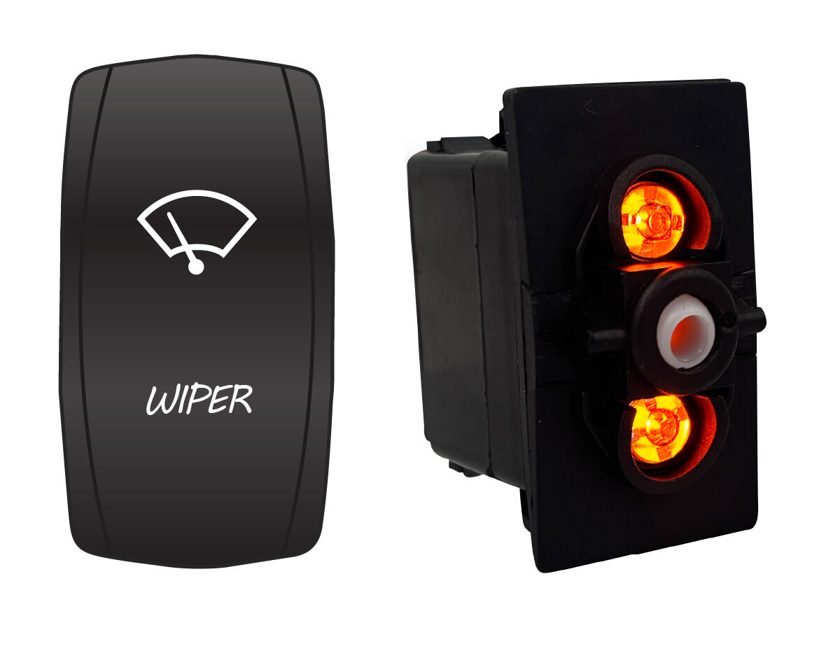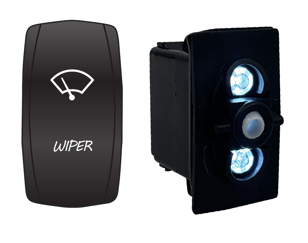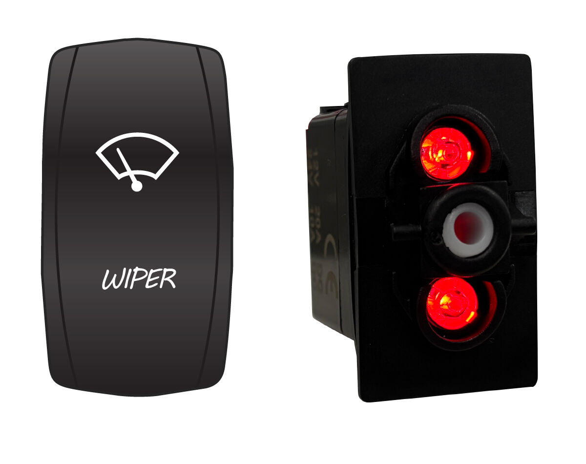 Water resistant, red or blue LED illuminated rocker switch with laser etched actuator cover. Dual voltage 12/24V equipped with durable and power efficient LED lamps.