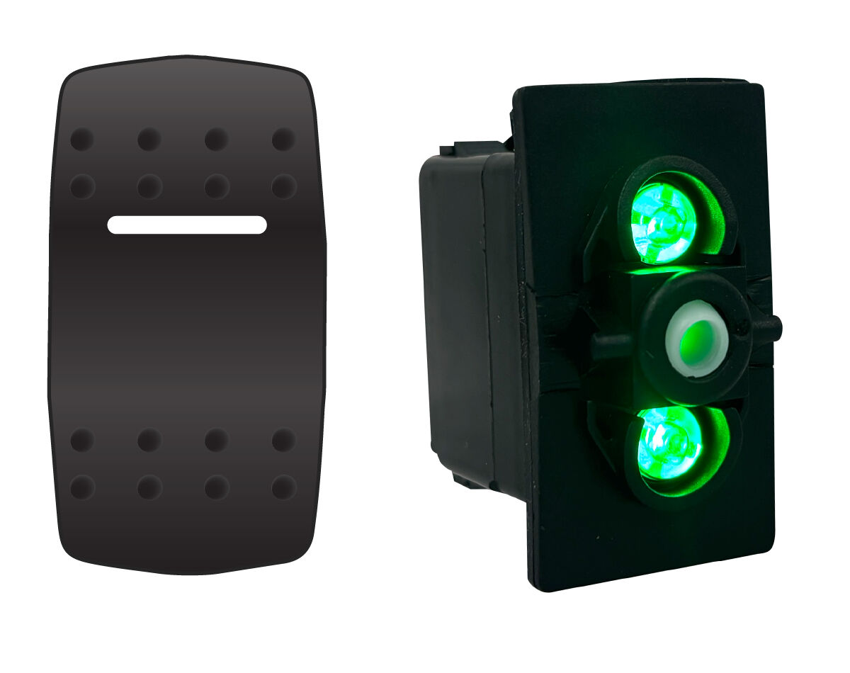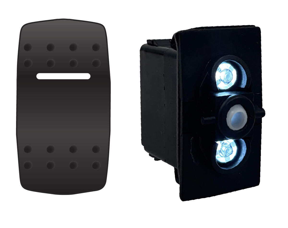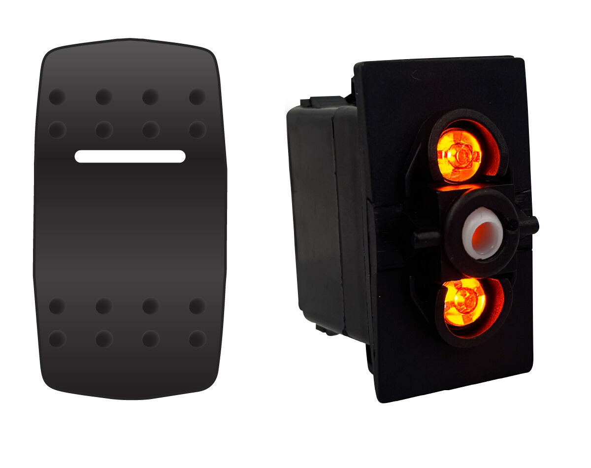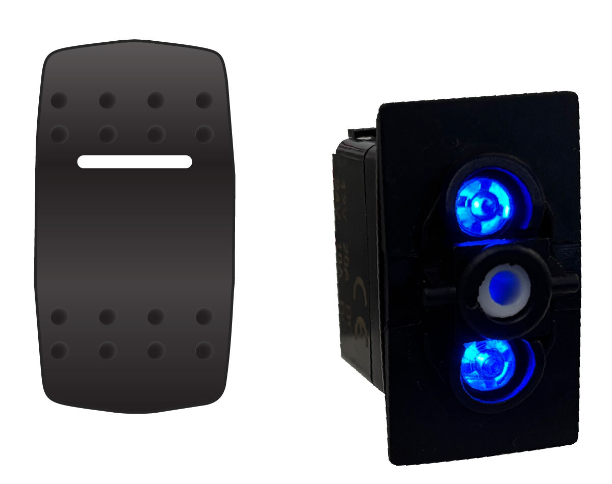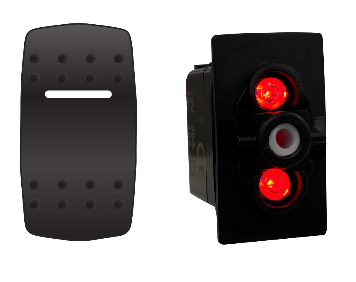 Water resistant, coloured LED illuminated rocker switch with blank single LED ribbed actuator cover. Dual voltage 12/24V equipped with durable and power efficient LED lamps.