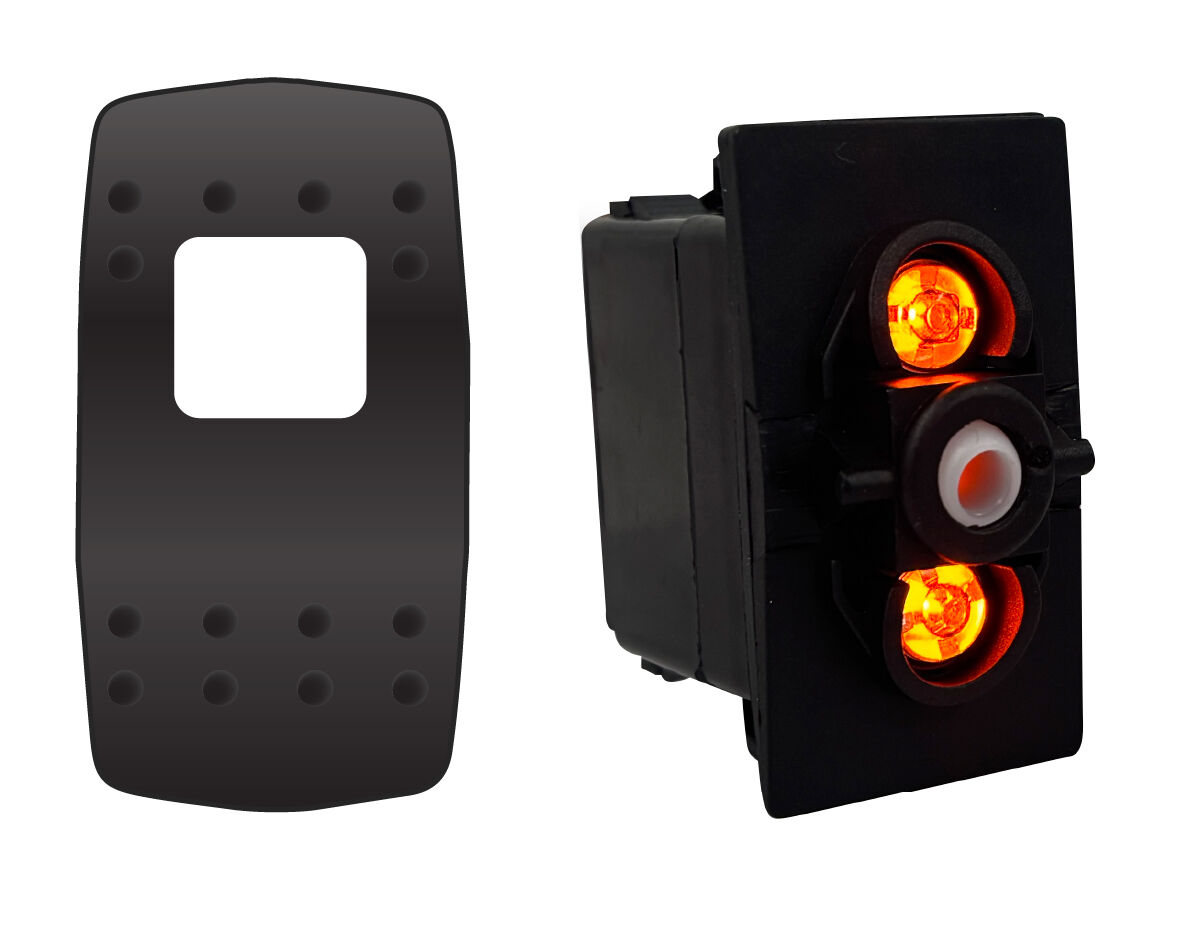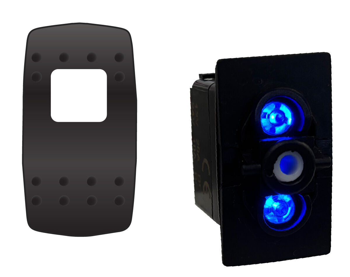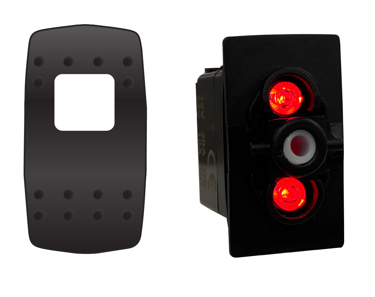Water resistant, coloured LED illuminated rocker switch with blank square LED ribbed actuator cover. Dual voltage 12/24V equipped with durable and power efficient LED lamps.