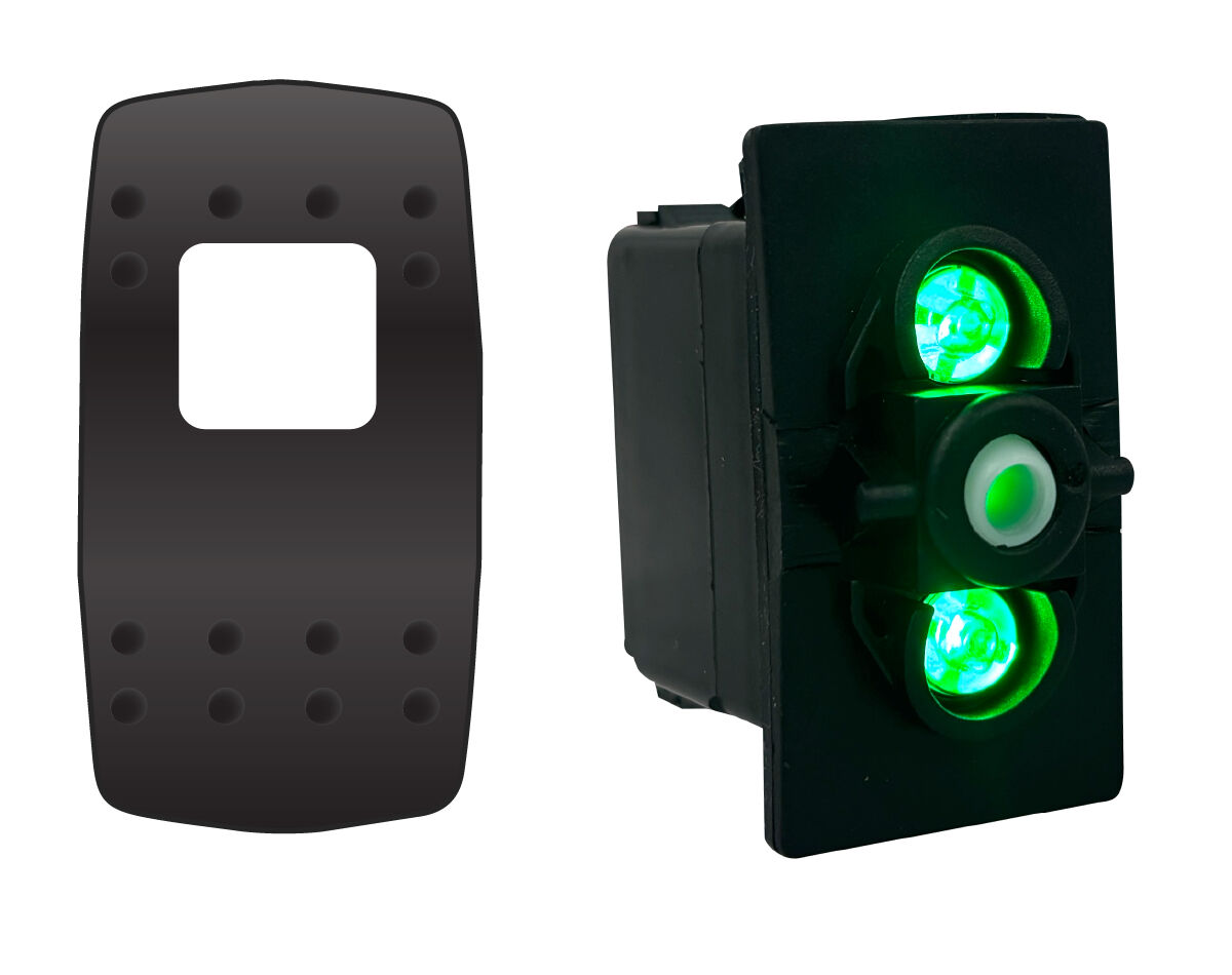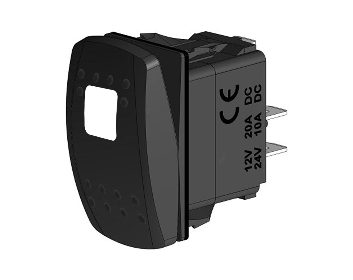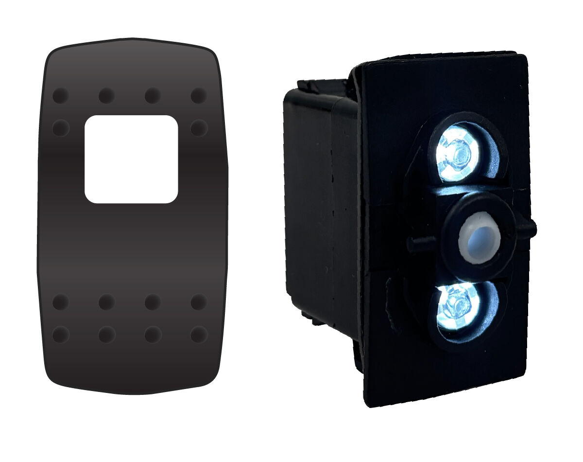 Water resistant, coloured LED illuminated rocker switch with blank square LED ribbed actuator cover. Dual voltage 12/24V equipped with durable and power efficient LED lamps.