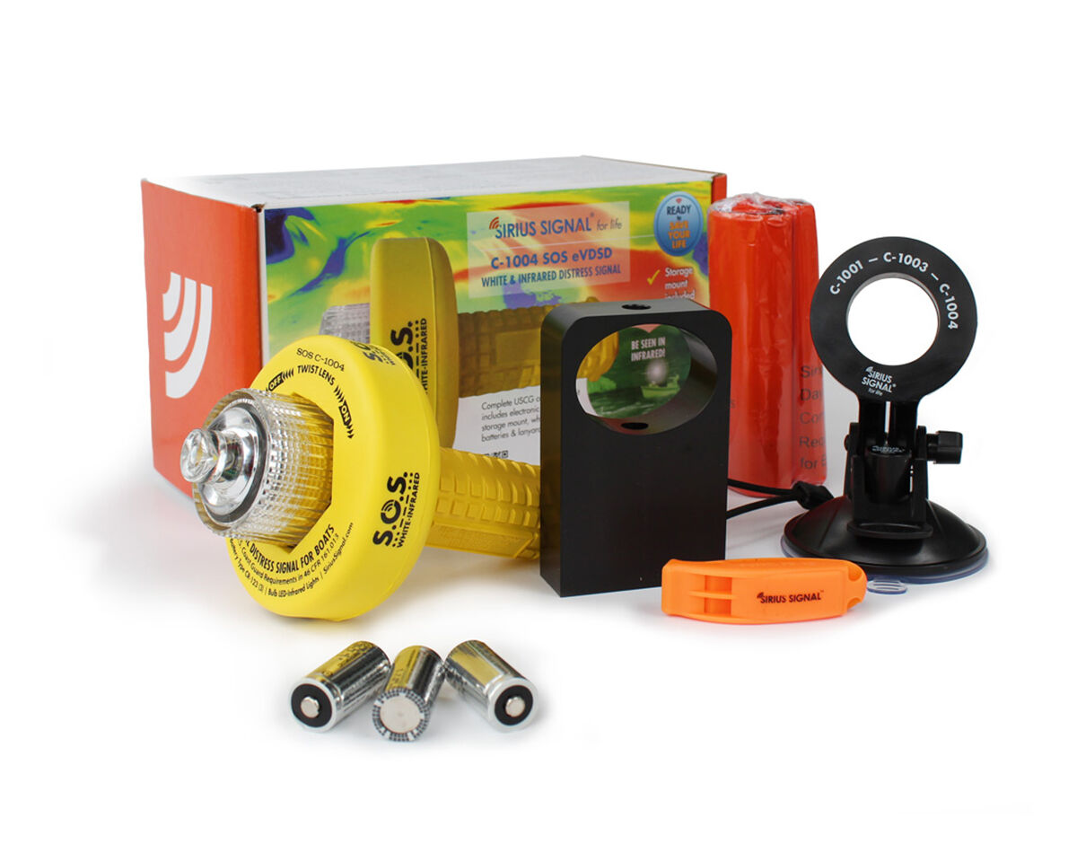 Stay safe on the water with the Sirius Signal C-1004 SOS Distress Light. This kit includes the distress light, a suction cup mount, a screw-in storage mount, a distress flag, and a quality marine whistle.