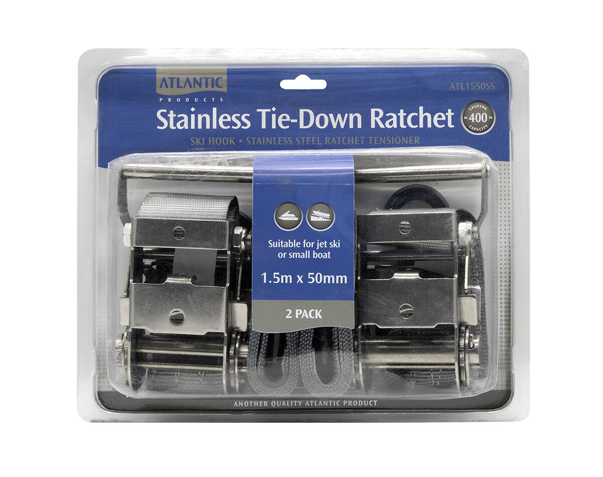 Keep your jet ski, tinny, or small boat safely in place with these durable Atlantic Tie-Down Ratchets. They feature stainless steel ratchet tensioners, PVC covered 'S' hooks and thick 1.5m long x 50mm thick UV-stabilised nylon webbing – a simple, reliable way to hold your load with ease.