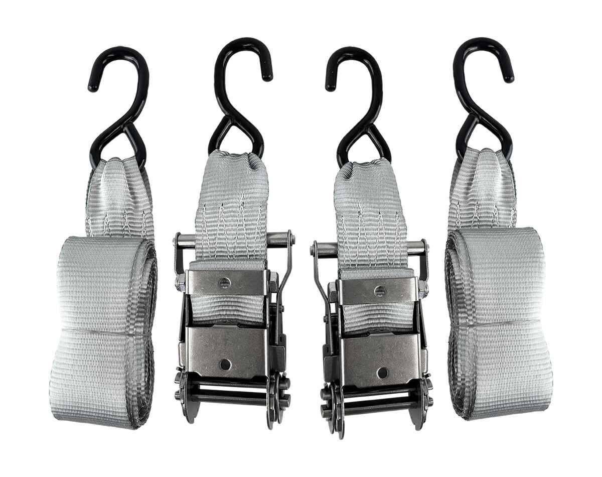 Designed for strength and durability, each stainless steel ratchet tensioners feature thick UV-stabilised, reinforced nylon webbing and PVC covered 'S' hooks, giving you peace of mind on every journey.