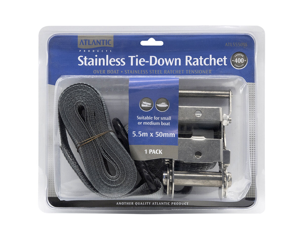 Keep your jet ski, tinny, or small boat safely in place with this durable Atlantic Tie-Down Ratchet. It features a stainless steel ratchet tensioner, PVC covered 'S' hooks and 4m long x 50mm thick UV-stabilised nylon webbing – a simple, reliable way to hold your load with ease.