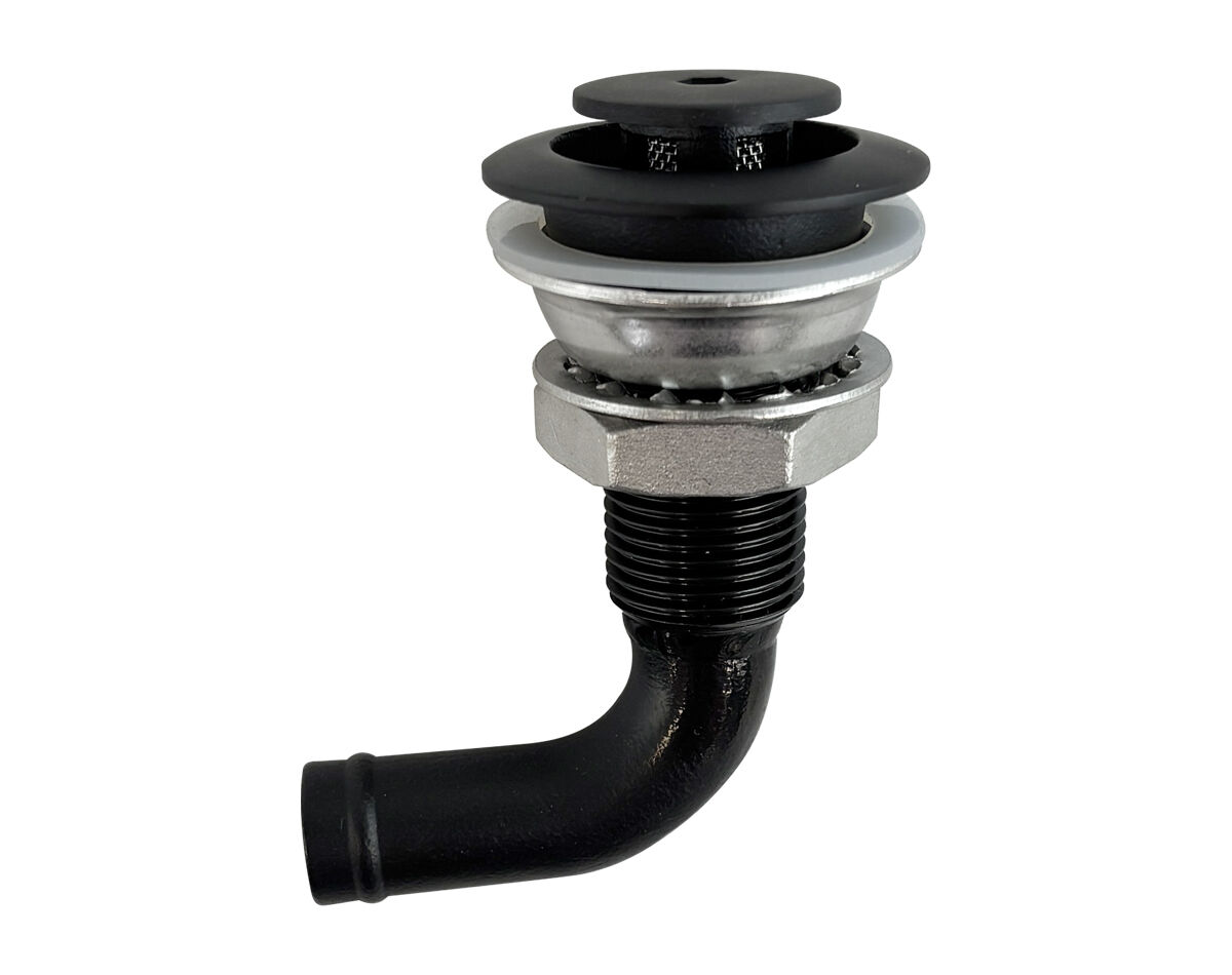 Black PVD coated 316-grade stainless steel recessed fuel breather vent with a 90 degree angled barb.