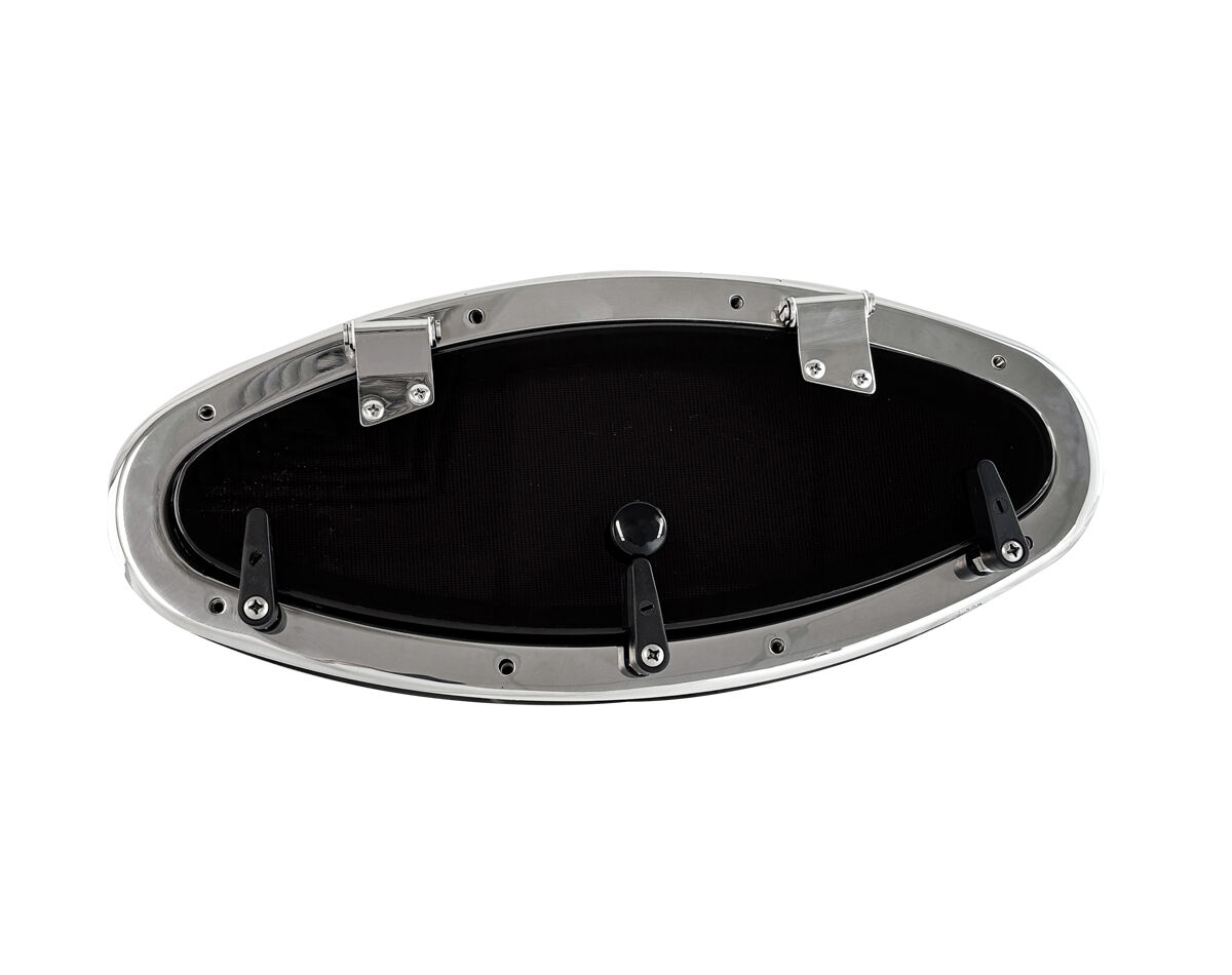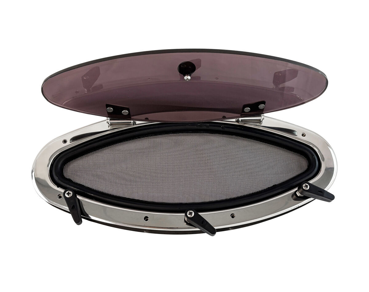 Elliptical Opening Portlight crafted from corrosion-resistant 316-grade stainless steel, featuring UV-resistant smoke acrylic glass and a built-in flyscreen.