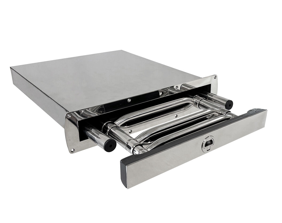 Keep your boarding area tidy and safe with this 316-grade stainless steel telescopic ladder. Neatly mounted into your boarding platform, it stays completely hidden in its flush-mounted box when not in use, maintaining a clean, unobstructed transom.